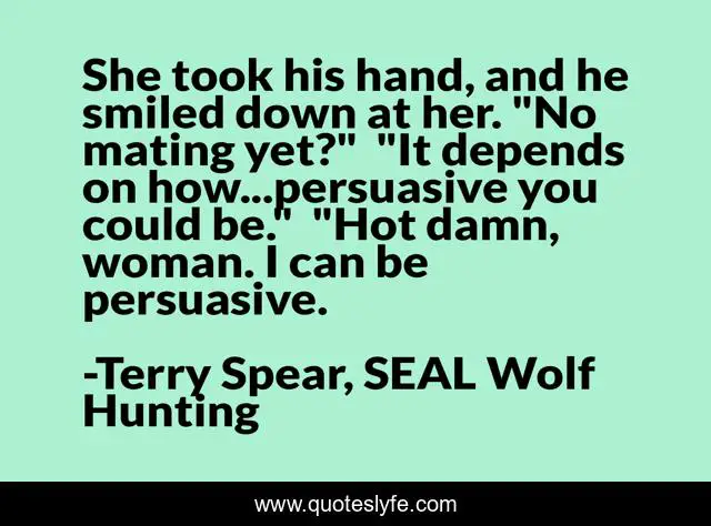 This page presents the quote "She took his hand, and he smiled down at her. "No mating yet?" "It depends on how...persuasive you could be." "Hot damn, woman. I can be persuasive.". Author of this quote is Terry Spear, SEAL Wolf Hunting. This quote is about military-romance, paranormal-romance, wolf-shifter-romance, navy-seal-romance,.