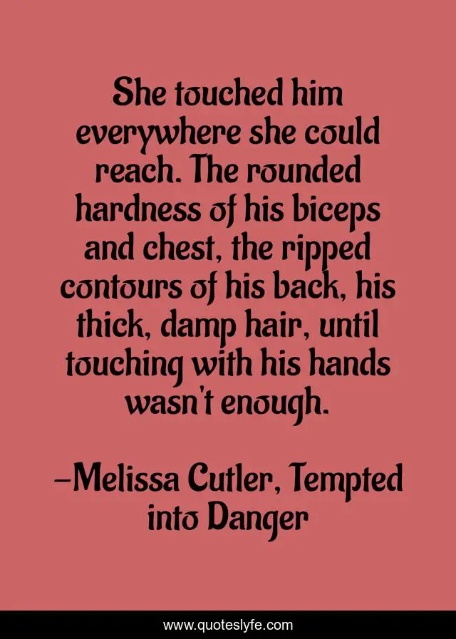 This page presents the quote "She touched him everywhere she could reach. The rounded hardness of his biceps and chest, the ripped contours of his back, his thick, damp hair, until touching with his hands wasn't enough.". Author of this quote is Melissa Cutler, Tempted into Danger. This quote is about romance, suspense, contemporary, black-ops,.