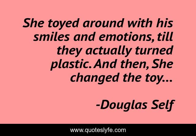 This page presents the quote "She toyed around with his smiles and emotions, till they actually turned plastic. And then, She changed the toy…". Author of this quote is Douglas Self. This quote is about playing-for-keeps, smiles, emotions, reality, games, escape,.