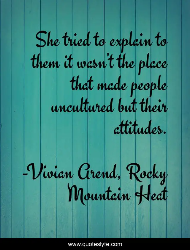This page presents the quote "She tried to explain to them it wasn't the place that made people uncultured but their attitudes.". Author of this quote is Vivian Arend, Rocky Mountain Heat. This quote is about culture, life, life-and-living, culture-identity,.
