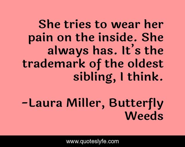 This page presents the quote "She tries to wear her pain on the inside. She always has. It’s the trademark of the oldest sibling, I think.". Author of this quote is Laura Miller, Butterfly Weeds. This quote is about my-butterfly, butterfly-weeds, love, contemporary-romance, affection,.