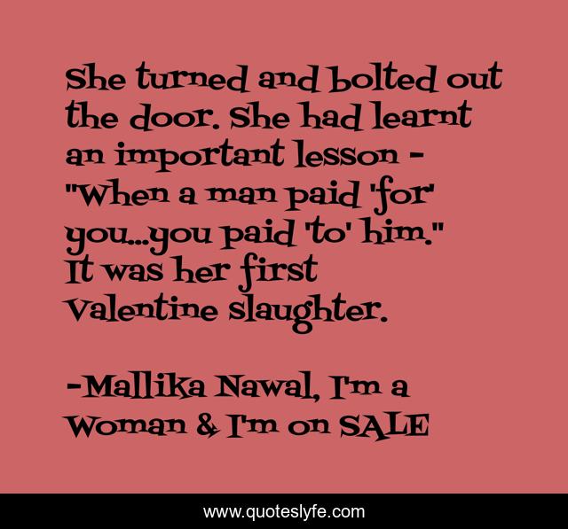 This page presents the quote "She turned and bolted out the door. She had learnt an important lesson - "When a man paid 'for' you...you paid 'to' him." It was her first Valentine slaughter.". Author of this quote is Mallika Nawal, I'm a Woman & I'm on SALE. This quote is about valentine-s-day, misogyny, woman-to-woman, relationship-advice, slaughter, valentine, woman, valentines-day, women-and-men,.
