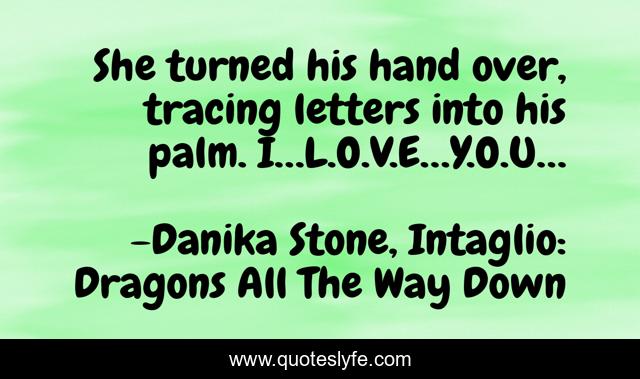 This page presents the quote "She turned his hand over, tracing letters into his palm. I…L.O.V.E…Y.O.U…". Author of this quote is Danika Stone, Intaglio: Dragons All The Way Down. This quote is about love, passion, affection,.