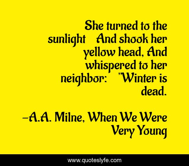 This page presents the quote "She turned to the sunlight And shook her yellow head, And whispered to her neighbor: "Winter is dead.". Author of this quote is A.A. Milne, When We Were Very Young. This quote is about spring, daffodils, winter, sunlight,.