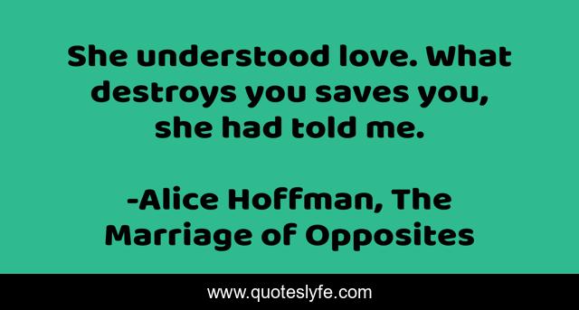 "Alice Hoffman, The Marriage of Opposites Quotes." Quoteslyfe.com, 2025. Fri. 05 Dec. 2025. <https://www.quoteslyfe.com/quote/She-understood-love-What-destroys-you-saves-227373>.
