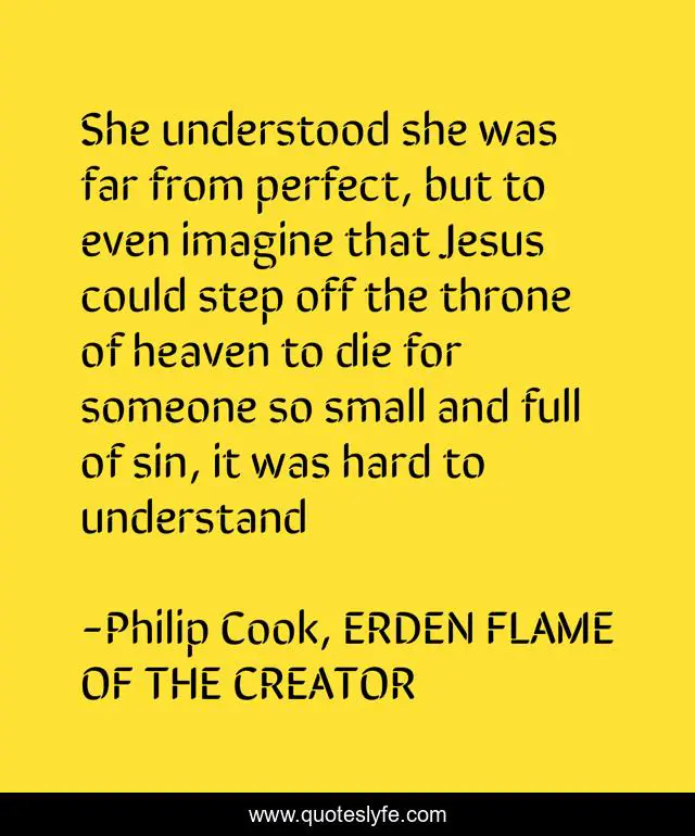 This page presents the quote "She understood she was far from perfect, but to even imagine that Jesus could step off the throne of heaven to die for someone so small and full of sin, it was hard to understand". Author of this quote is Philip Cook, ERDEN FLAME OF THE CREATOR. This quote is about faith, sin, fantasy-fiction, christianity,.