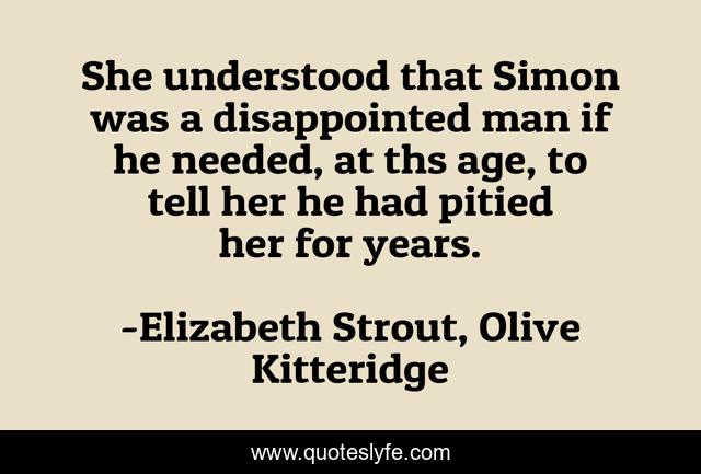This page presents the quote "She understood that Simon was a disappointed man if he needed, at ths age, to tell her he had pitied her for years.". Author of this quote is Elizabeth Strout, Olive Kitteridge. .
