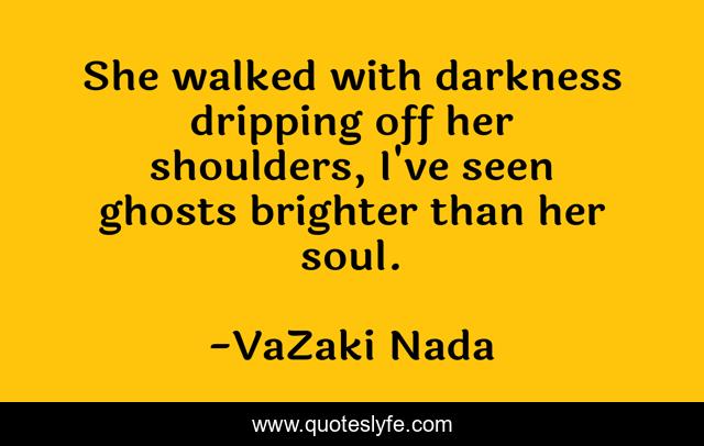 This page presents the quote "She walked with darkness dripping off her shoulders, I've seen ghosts brighter than her soul.". Author of this quote is VaZaki Nada. This quote is about ghost, girl, ghosts, depression, darkness,.