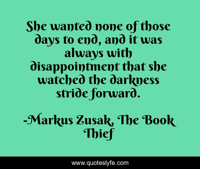 This page presents the quote "She wanted none of those days to end, and it was always with disappointment that she watched the darkness stride forward.". Author of this quote is Markus Zusak, The Book Thief. This quote is about night, disappointment, change, time,.