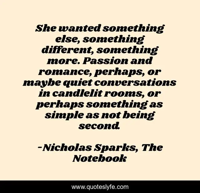 This page presents the quote "She wanted something else, something different, something more. Passion and romance, perhaps, or maybe quiet conversations in candlelit rooms, or perhaps something as simple as not being second.". Author of this quote is Nicholas Sparks, The Notebook. This quote is about romance, love, passion, affection,.