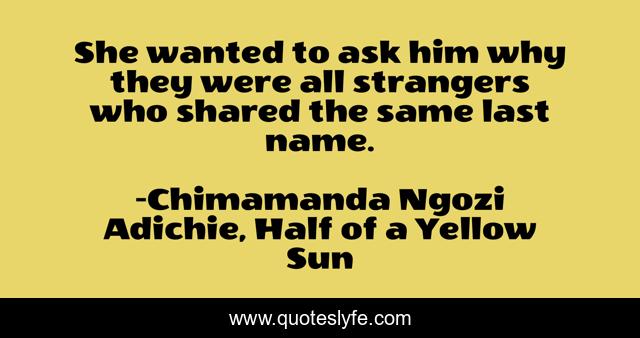 This page presents the quote "She wanted to ask him why they were all strangers who shared the same last name.". Author of this quote is Chimamanda Ngozi Adichie, Half of a Yellow Sun. .
