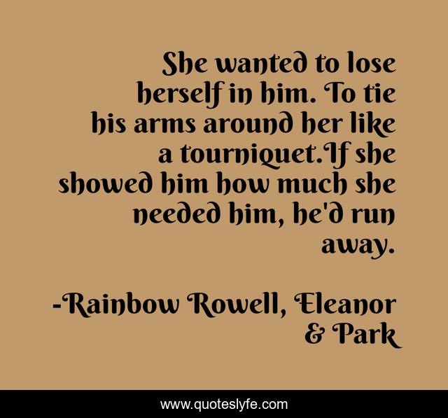 This page presents the quote "She wanted to lose herself in him. To tie his arms around her like a tourniquet.If she showed him how much she needed him, he'd run away.". Author of this quote is Rainbow Rowell, Eleanor & Park. This quote is about need, fear, despair, love, affection,.