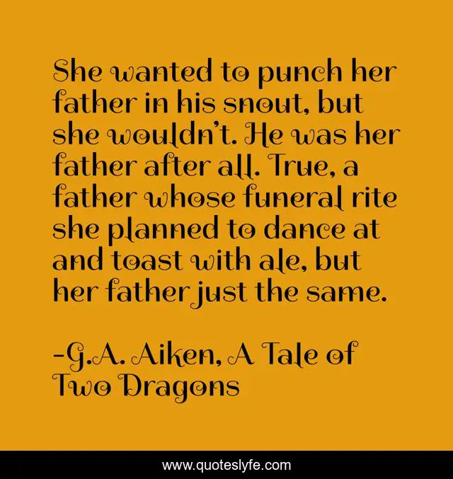 This page presents the quote "She wanted to punch her father in his snout, but she wouldn’t. He was her father after all. True, a father whose funeral rite she planned to dance at and toast with ale, but her father just the same.". Author of this quote is G.A. Aiken, A Tale of Two Dragons. This quote is about daughter, father, hate,.