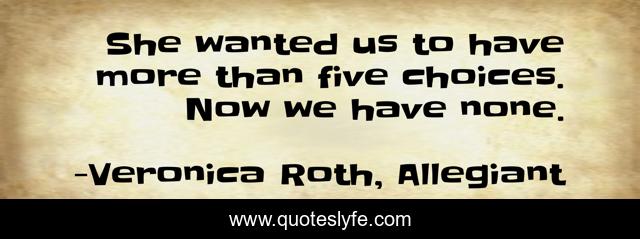 This page presents the quote "She wanted us to have more than five choices. Now we have none.". Author of this quote is Veronica Roth, Allegiant. .