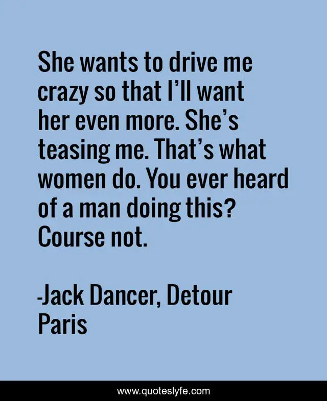 This page presents the quote "She wants to drive me crazy so that I’ll want her even more. She’s teasing me. That’s what women do. You ever heard of a man doing this? Course not.". Author of this quote is Jack Dancer, Detour Paris. This quote is about men-and-women, men, teasing, women,.