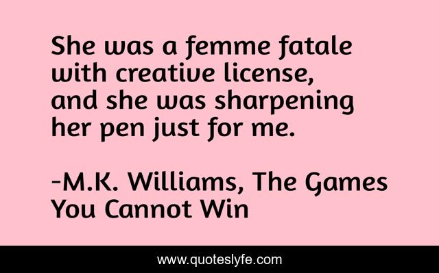 "M.K. Williams, The Games You Cannot Win Quotes." Quoteslyfe.com, 2025. Fri. 05 Dec. 2025. <https://www.quoteslyfe.com/quote/She-was-a-femme-fatale-with-creative-217517>.