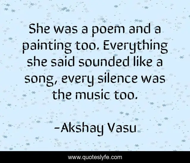 This page presents the quote "She was a poem and a painting too. Everything she said sounded like a song, every silence was the music too.". Author of this quote is Akshay Vasu. This quote is about poem, art, song, music, she, words, painting, silence,.