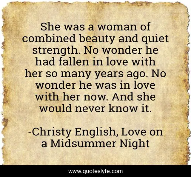This page presents the quote "She was a woman of combined beauty and quiet strength. No wonder he had fallen in love with her so many years ago. No wonder he was in love with her now. And she would never know it.". Author of this quote is Christy English, Love on a Midsummer Night. This quote is about falling-in-love, love, beauty, romance, strength, passion, starcrossed, affection,.