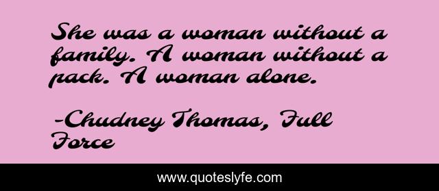 This page presents the quote "She was a woman without a family. A woman without a pack. A woman alone.". Author of this quote is Chudney Thomas, Full Force. This quote is about paranormal-romance, shifter-romance,.