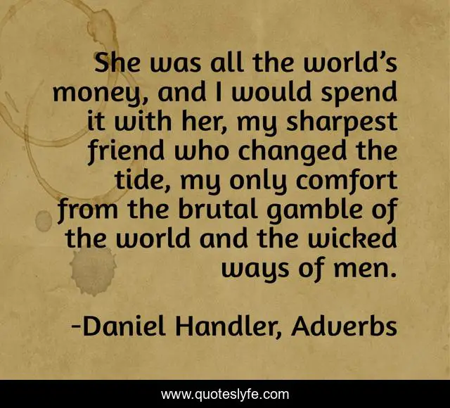 This page presents the quote "She was all the world’s money, and I would spend it with her, my sharpest friend who changed the tide, my only comfort from the brutal gamble of the world and the wicked ways of men.". Author of this quote is Daniel Handler, Adverbs. .