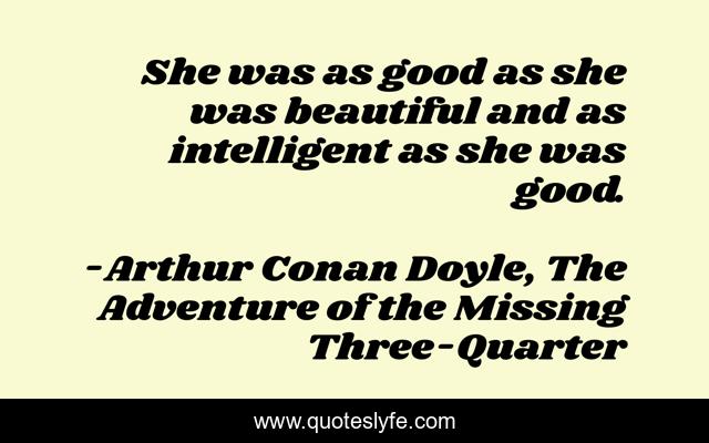 This page presents the quote "She was as good as she was beautiful and as intelligent as she was good.". Author of this quote is Arthur Conan Doyle, The Adventure of the Missing Three-Quarter. This quote is about intelligence, sherlock-holmes, integrity, beauty, women,.