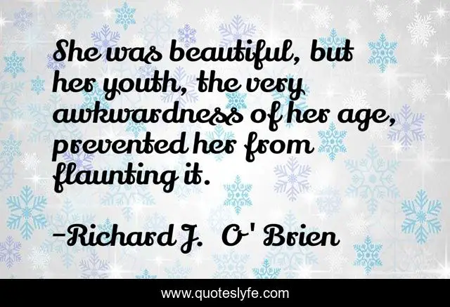 This page presents the quote "She was beautiful, but her youth, the very awkwardness of her age, prevented her from flaunting it.". Author of this quote is Richard J. O'Brien. This quote is about beautiful, teen, age, beauty, youth,.