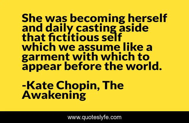 This page presents the quote "She was becoming herself and daily casting aside that fictitious self which we assume like a garment with which to appear before the world.". Author of this quote is Kate Chopin, The Awakening. .