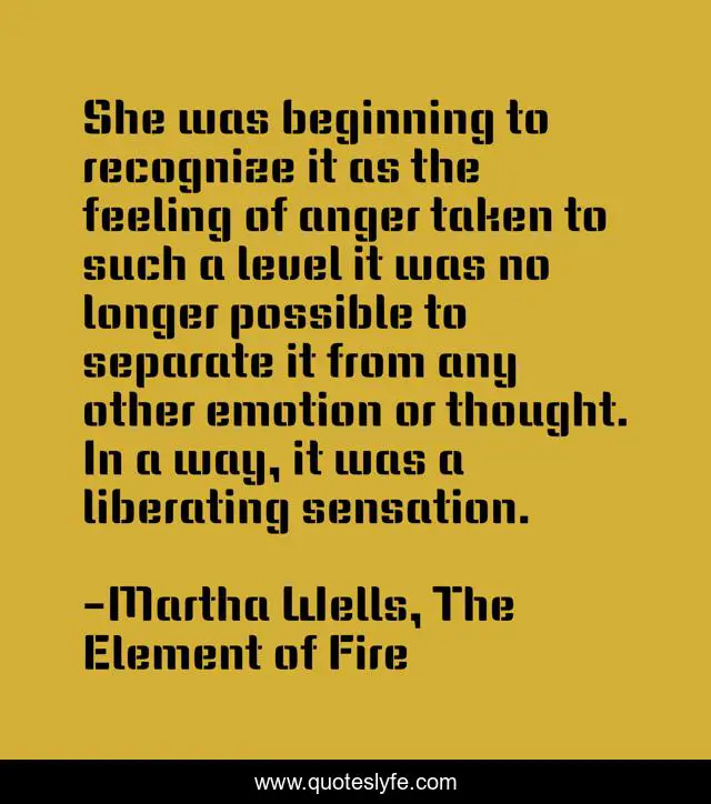 This page presents the quote "She was beginning to recognize it as the feeling of anger taken to such a level it was no longer possible to separate it from any other emotion or thought. In a way, it was a liberating sensation.". Author of this quote is Martha Wells, The Element of Fire. This quote is about anger, liberation, anger-courage, rage,.
