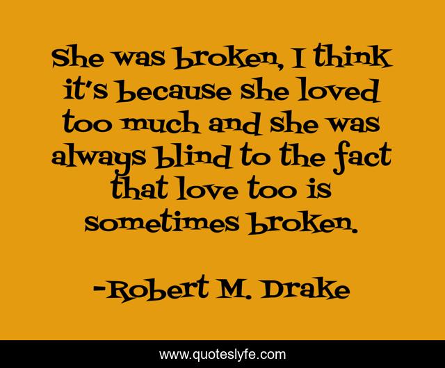 This page presents the quote "She was broken, I think it’s because she loved too much and she was always blind to the fact that love too is sometimes broken.". Author of this quote is Robert M. Drake. This quote is about lovequotes, sadquotes, poetry, quotes, instadaily, happyquotes, relationships, sayings, writer,.