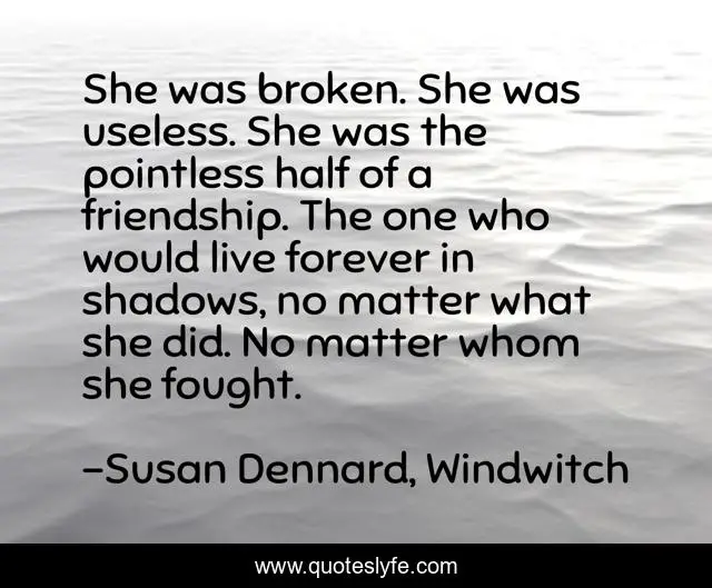 "Susan Dennard, Windwitch Quotes." Quoteslyfe.com, 2025. Sun. 07 Dec. 2025. <https://www.quoteslyfe.com/quote/She-was-broken-She-was-useless-She-245992>.