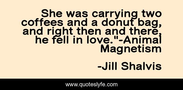 This page presents the quote "She was carrying two coffees and a donut bag, and right then and there, he fell in love."-Animal Magnetism". Author of this quote is Jill Shalvis. .