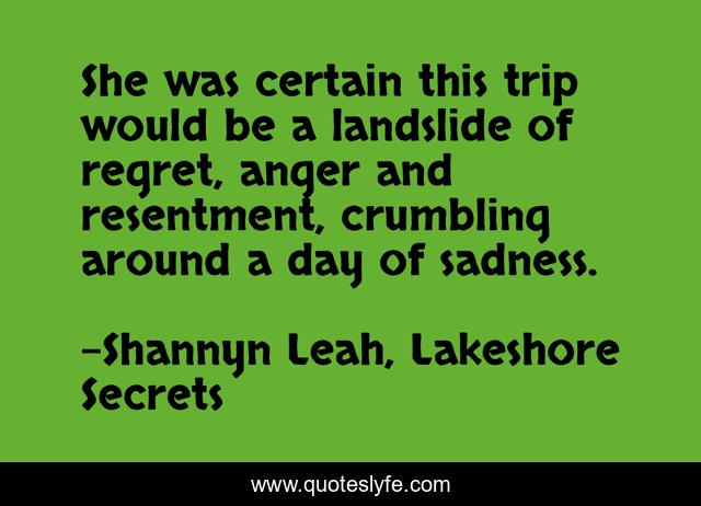 This page presents the quote "She was certain this trip would be a landslide of regret, anger and resentment, crumbling around a day of sadness.". Author of this quote is Shannyn Leah, Lakeshore Secrets. This quote is about books, book, books-reading, book-lovers,.