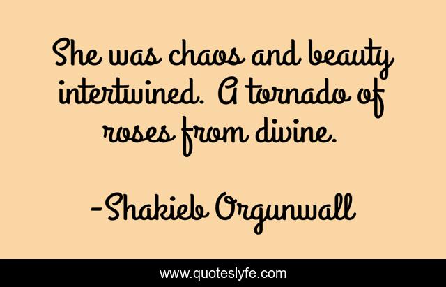 This page presents the quote "She was chaos and beauty intertwined. A tornado of roses from divine.". Author of this quote is Shakieb Orgunwall. This quote is about madness, rose, quotes-about-love, she, quotes-about-lovers, love, friendship, affection,.