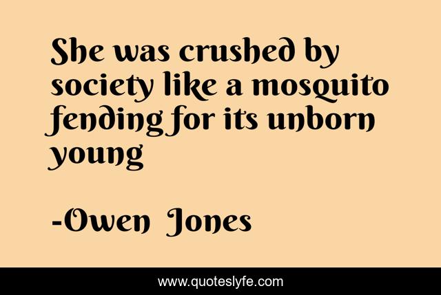 This page presents the quote "She was crushed by society like a mosquito fending for its unborn young". Author of this quote is Owen Jones. This quote is about behind-the-smile, mosquitoes, quote,.