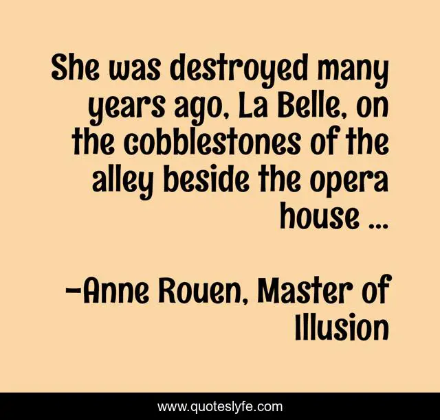 This page presents the quote "She was destroyed many years ago, La Belle, on the cobblestones of the alley beside the opera house ...". Author of this quote is Anne Rouen, Master of Illusion. This quote is about historical-fiction, historical-romance,.