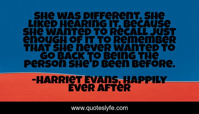 This page presents the quote "She was different. She liked hearing it, because she wanted to recall just enough of it to remember that she never wanted to go back to being the person she'd been before.". Author of this quote is Harriet Evans, Happily Ever After. .