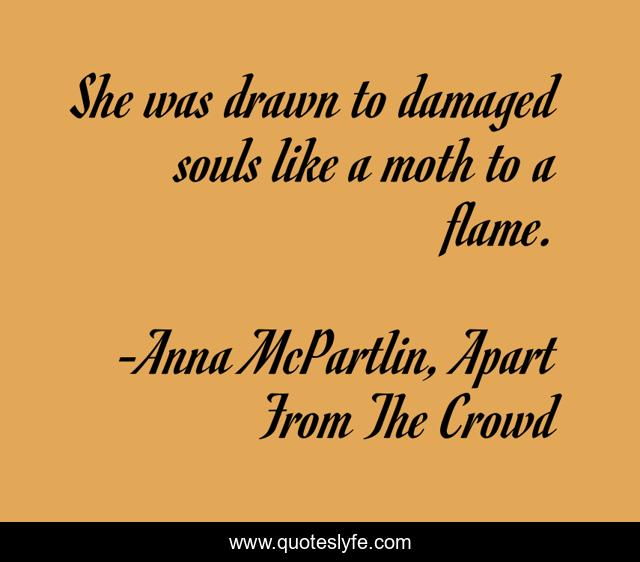 This page presents the quote "She was drawn to damaged souls like a moth to a flame.". Author of this quote is Anna McPartlin, Apart From The Crowd. This quote is about heartbreak, love, affection, damaged-souls,.