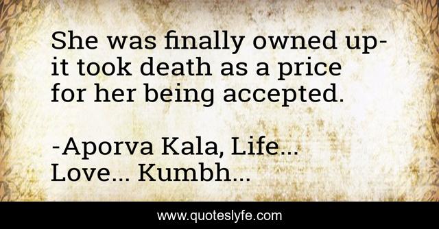 This page presents the quote "She was finally owned up- it took death as a price for her being accepted.". Author of this quote is Aporva Kala, Life... Love... Kumbh.... This quote is about girl, death, love, affection,.