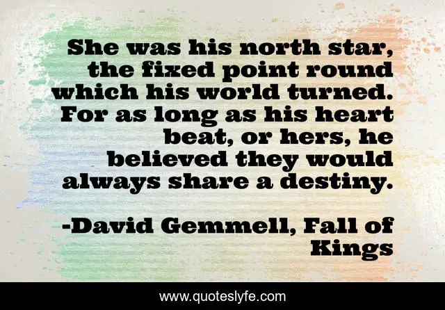 This page presents the quote "She was his north star, the fixed point round which his world turned. For as long as his heart beat, or hers, he believed they would always share a destiny.". Author of this quote is David Gemmell, Fall of Kings. This quote is about devotion, love, destiny, affection,.