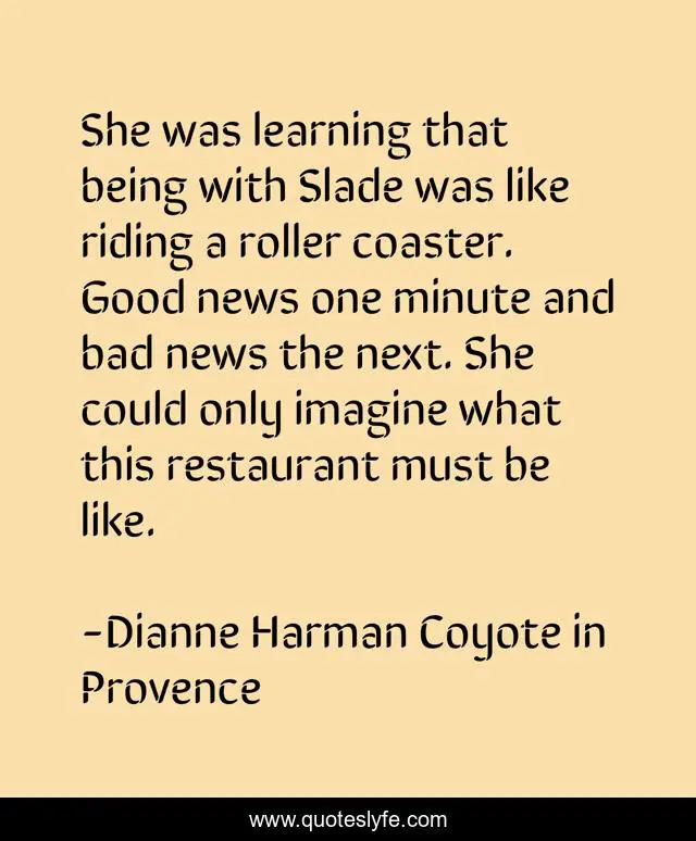 This page presents the quote "She was learning that being with Slade was like riding a roller coaster. Good news one minute and bad news the next. She could only imagine what this restaurant must be like.". Author of this quote is Dianne Harman Coyote in Provence. This quote is about afghanistan, art-theft, murder, food, orphans, female-genitalia-mutilation, provence,.
