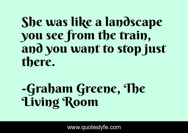 This page presents the quote "She was like a landscape you see from the train, and you want to stop just there.". Author of this quote is Graham Greene, The Living Room. This quote is about play, psychology, script, catholicism, fiction, existentialism, fear-of-death,.