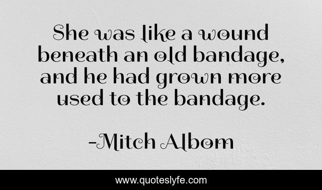 This page presents the quote "She was like a wound beneath an old bandage, and he had grown more used to the bandage.". Author of this quote is Mitch Albom. This quote is about enthusiasm, romantic, inspirational,.