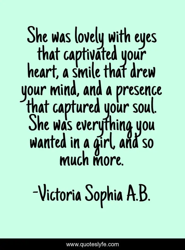 This page presents the quote "She was lovely with eyes that captivated your heart, a smile that drew your mind, and a presence that captured your soul. She was everything you wanted in a girl, and so much more.". Author of this quote is Victoria Sophia A.B.. This quote is about beautiful, love, captivating, beauty, girls, gorgeous, lovely, affection, uplifting,.