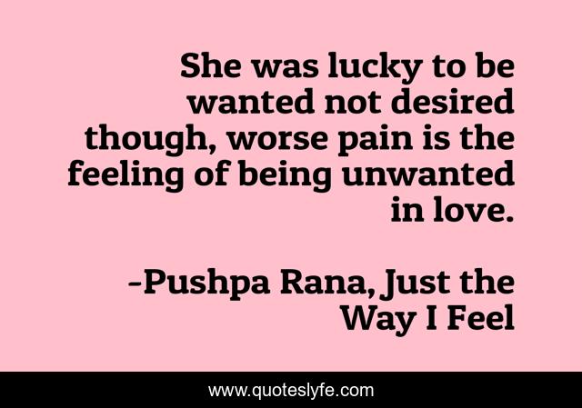 This page presents the quote "She was lucky to be wanted not desired though, worse pain is the feeling of being unwanted in love.". Author of this quote is Pushpa Rana, Just the Way I Feel. This quote is about love, rejected, desired, unwanted, judge, judgemental, fear, wanted, affection,.