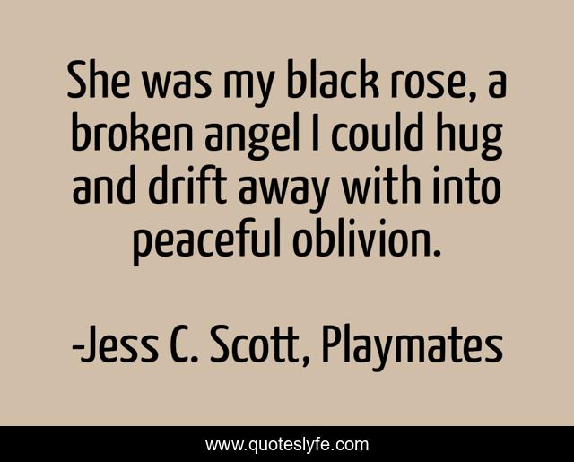 This page presents the quote "She was my black rose, a broken angel I could hug and drift away with into peaceful oblivion.". Author of this quote is Jess C. Scott, Playmates. This quote is about oblivion, dark-fiction, darkness, peace,.