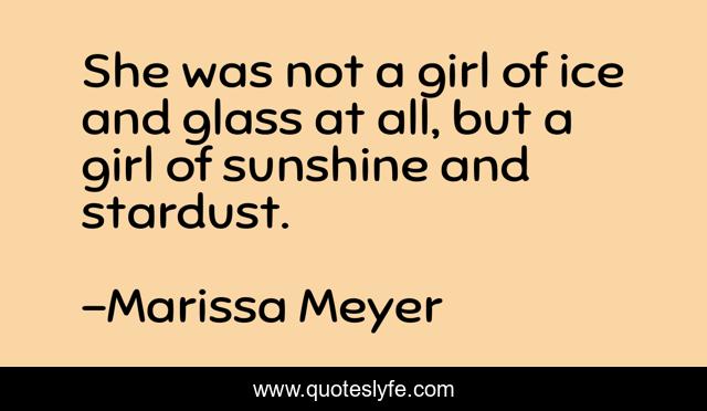 This page presents the quote "She was not a girl of ice and glass at all, but a girl of sunshine and stardust.". Author of this quote is Marissa Meyer. .
