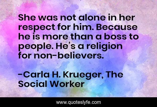 This page presents the quote "She was not alone in her respect for him. Because he is more than a boss to people. He’s a religion for non-believers.". Author of this quote is Carla H. Krueger, The Social Worker. This quote is about religion, social-worker, powerful-men, carla-h-krueger, gangster, respect, boss, leader, revere,.