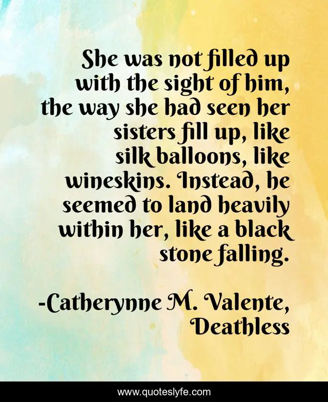 This page presents the quote "She was not filled up with the sight of him, the way she had seen her sisters fill up, like silk balloons, like wineskins. Instead, he seemed to land heavily within her, like a black stone falling.". Author of this quote is Catherynne M. Valente, Deathless. .