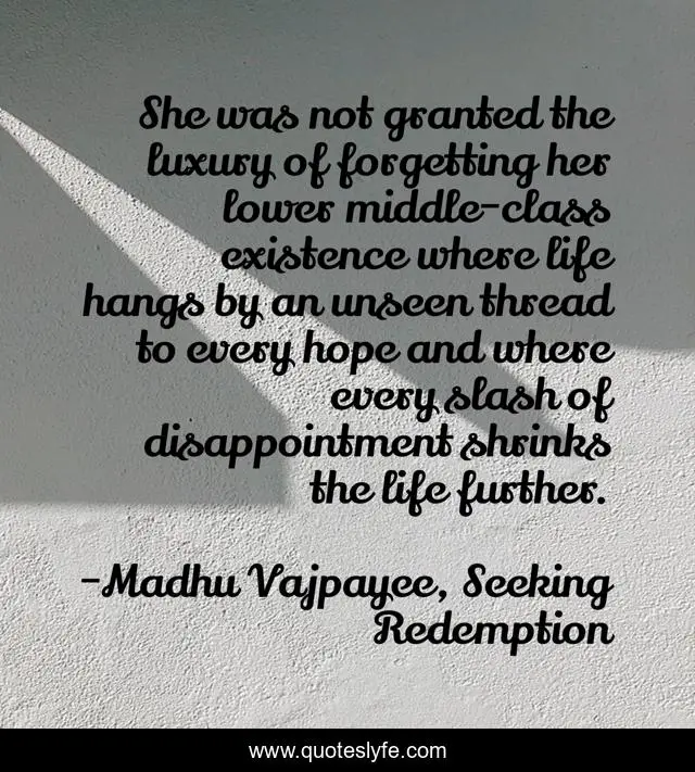 This page presents the quote "She was not granted the luxury of forgetting her lower middle-class existence where life hangs by an unseen thread to every hope and where every slash of disappointment shrinks the life further.". Author of this quote is Madhu Vajpayee, Seeking Redemption. This quote is about poverty, disappointment, hope,.