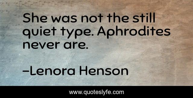 This page presents the quote "She was not the still quiet type. Aphrodites never are.". Author of this quote is Lenora Henson. This quote is about witchcraft, fiction-novel, witchy-fiction, book, witches, redhead,.